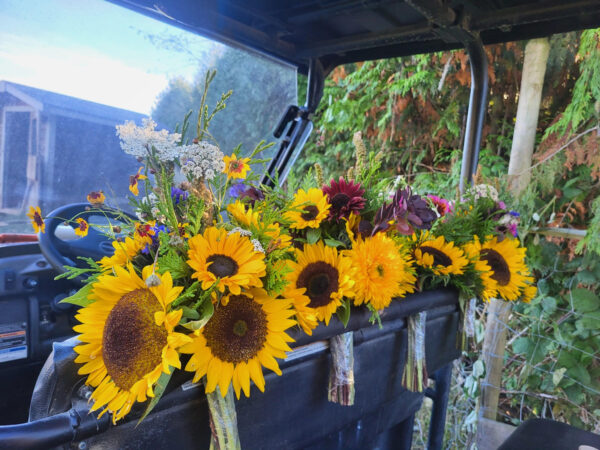 Brighten your space with our vibrant farm-fresh bouquets, lovingly grown and hand-wrapped right here on The Truffle Farm. Each stunning arrangement features golden sunflowers complemented by seasonal wildflowers in purples, whites, and deep burgundies.